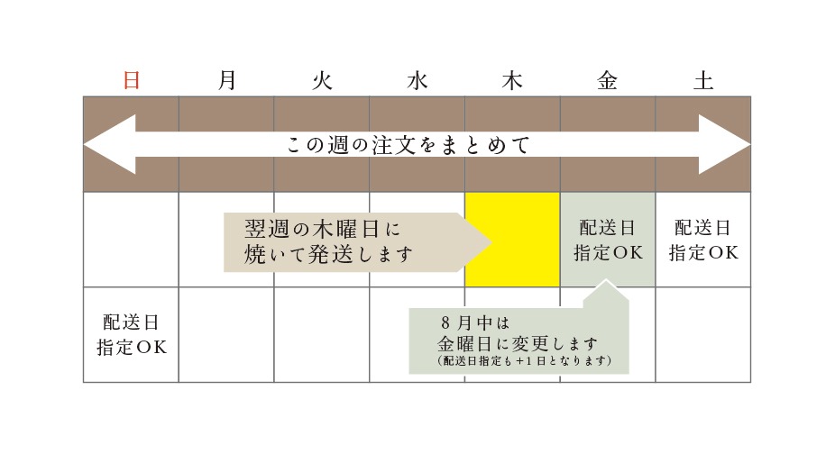 (8月中の注文に関しては、翌週の金曜日に焼き上げ発送させていただきます。)
