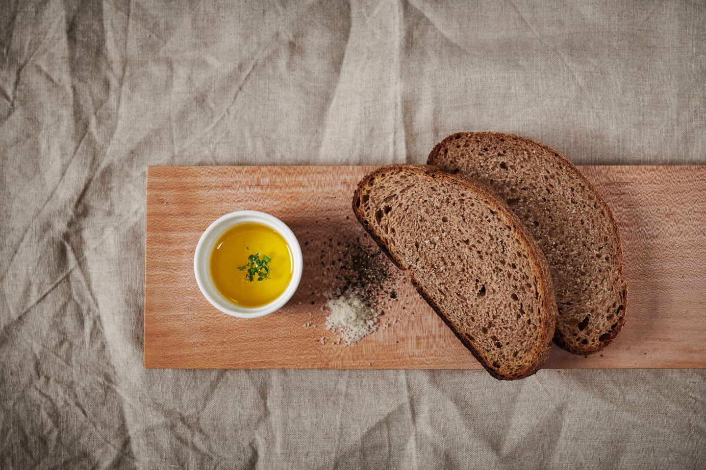 カンパーニュNo.1は、皮の旨みを感じるため、塩胡椒を加えたオリーブオイルに浸しながら食べる方法をお勧めします。。